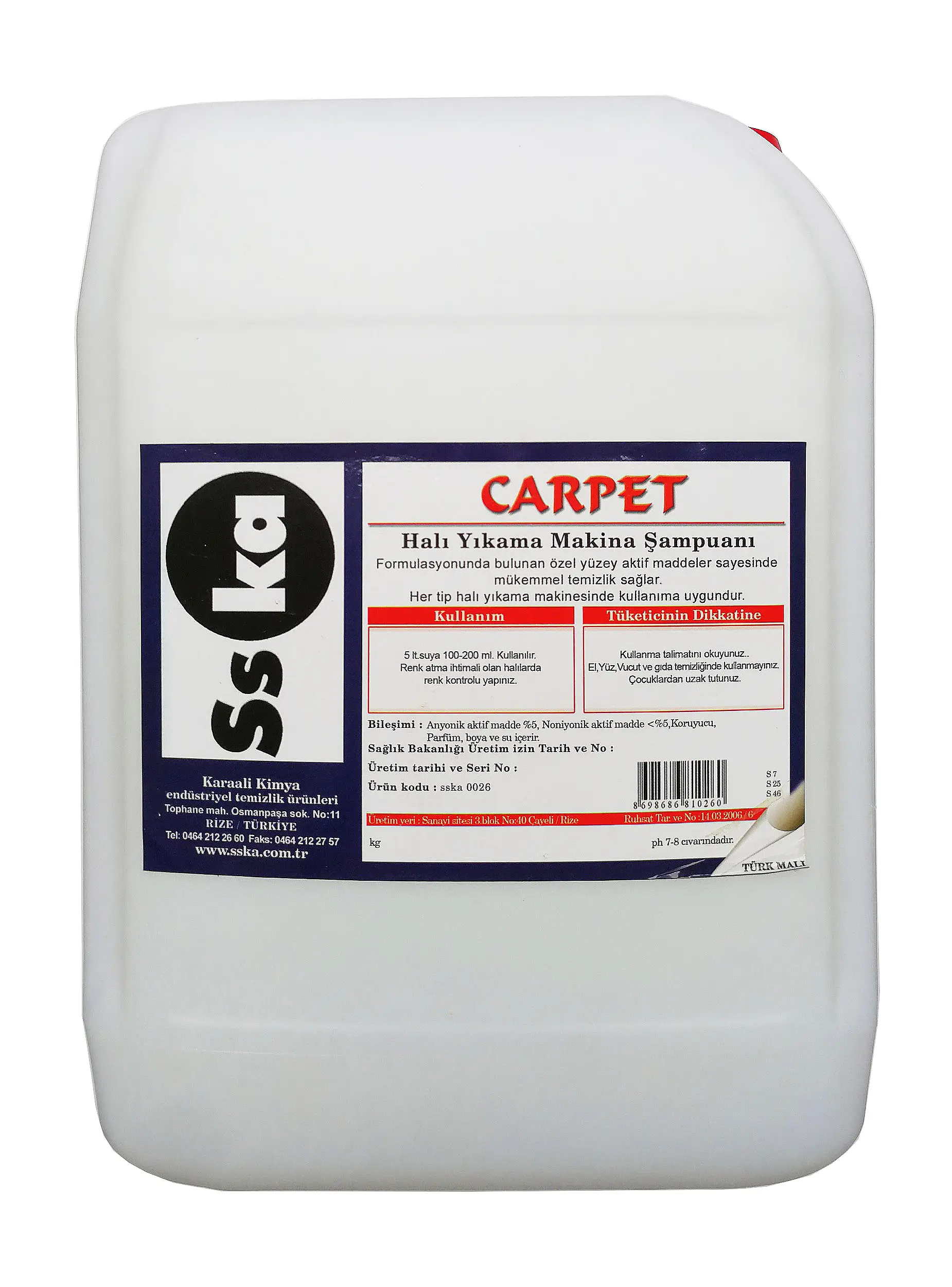| Etiketler | SSKA Halı Yıkama Makine Şampuanı Deterjanı / Az Köpüren Matik Halı Şampuanı / 5 Kg. / Bidon |