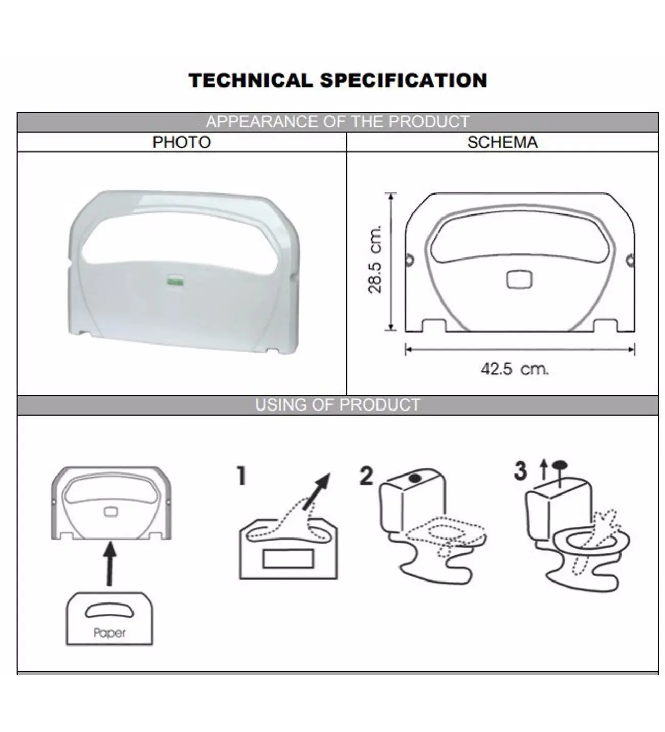 Hafif darbelere karşı yüksek mukavemet özelliğine sahip olan tasarım uzun yıllar kullanım şansı tanır. Klozet kapağı örtüsü olarak kullanılan kağıt örtülerin hijyenik ve düzgün bir şekilde muhafaza edilmesini sağlar.